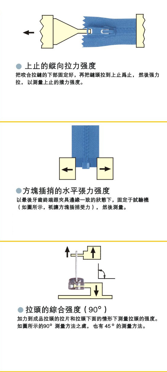 測試拉鏈強度,有種種的檢查方法。基本強度可用下列檢查方法測試。從這些結果,判斷適合拉鏈用途的綜合強度。